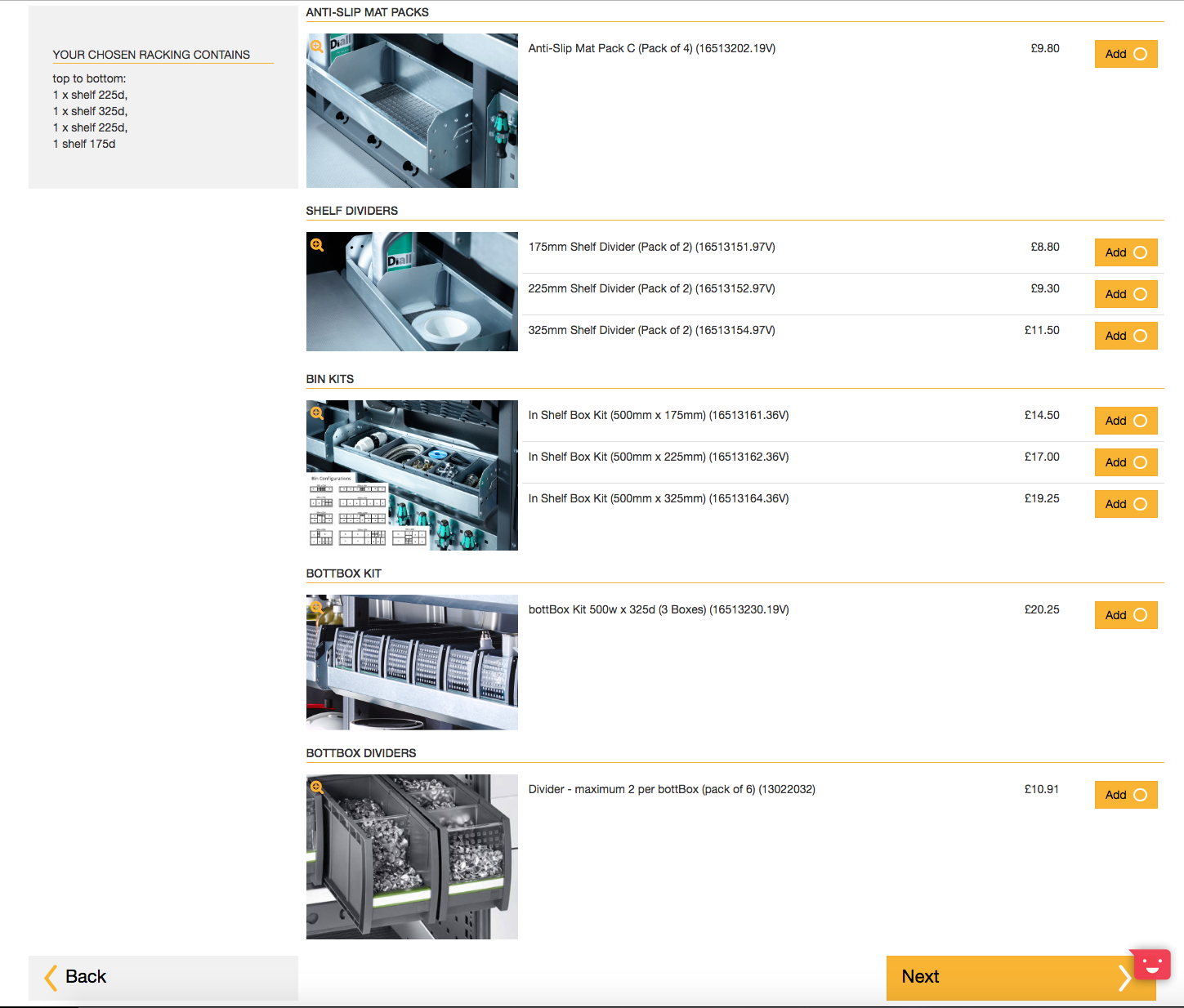 From sizing and placement options, to a multitude of different in-rack options suitable for different professions, we crafted a smooth process which not only gives visuals of each component as they are added, but also takes care of preventing conflicting options at the same time. And, once designed, each order is then imported directly into the Bott order management system, resulting in a complete automation of what was once a tedious customer experience.